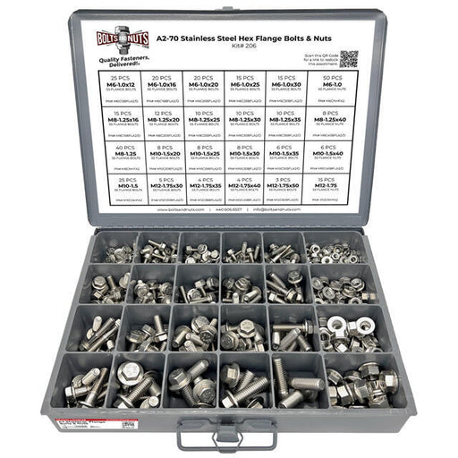 Part Number: Assortment Kit #206343 Pieces - Coarse ThreadStainless Steel A2-70 Metric Hex Flange Bolt & Nut Assortment Bolt Information:A2-70 ...